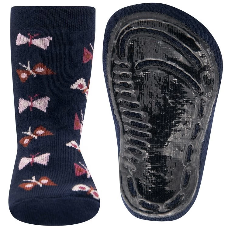Antislipsok Ewers – Donkerblauw met kleine vlindertjes in zachte kleuren.