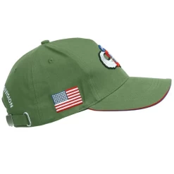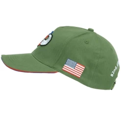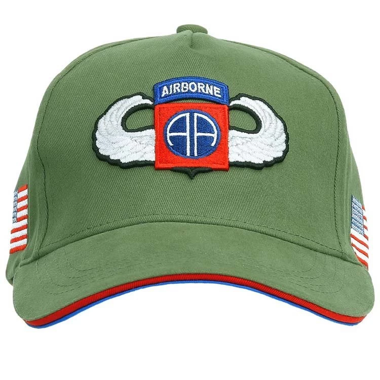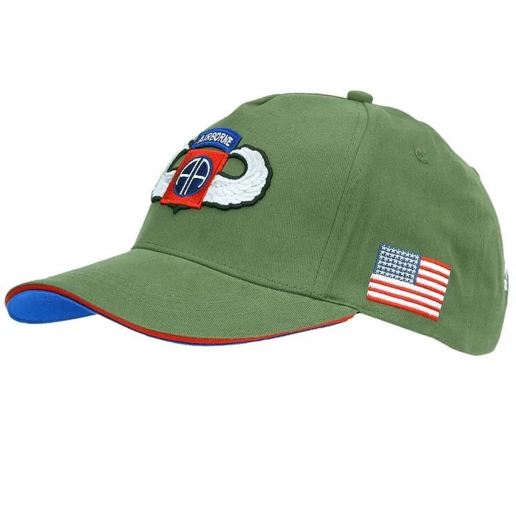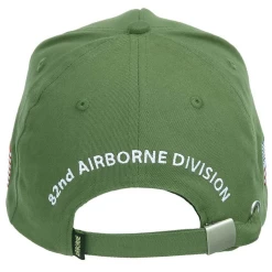 Op de voorkant van de pet staat een groot geborduurd Airborne logo. Op beide zijkanten vind je een Amerikaanse vlag. En op de achterkant staat ‘82nd AIRBORNE DIVISION’ in witte letters. De onderkant van de klep is blauw.