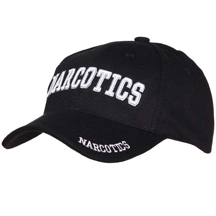Een stoere zwarte cap met op de voorkant het woord ‘NARCOTICS’ geborduurd in witte letters. Op de klep van de pet staat nog een keer ‘NARCOTICS’ geborduurd.