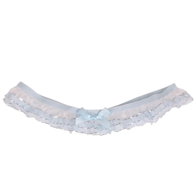 De band is gemaakt van blauw elastisch kant met een strikje.