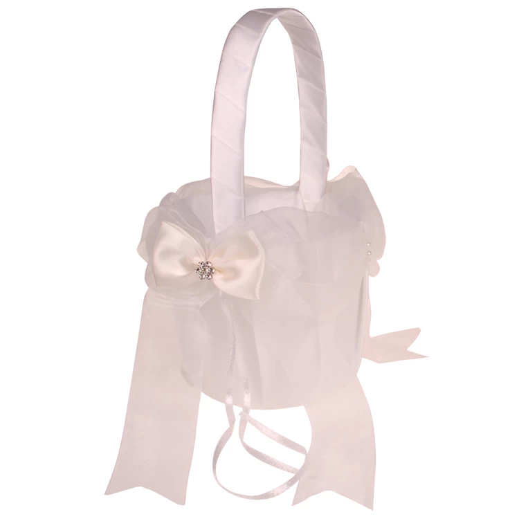 Bloemenmandje Ivoorkleurig met Organza Strik, Pareltjes en Strass.