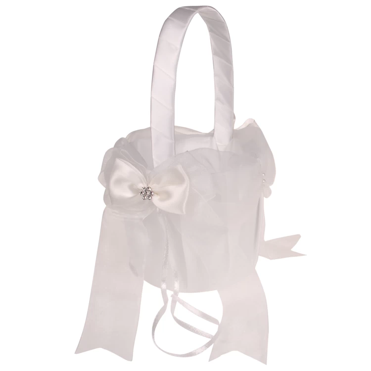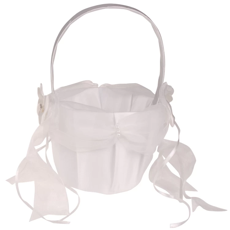 Bloemenmandje Wit met Organza Strik, Pareltjes en Strass.
