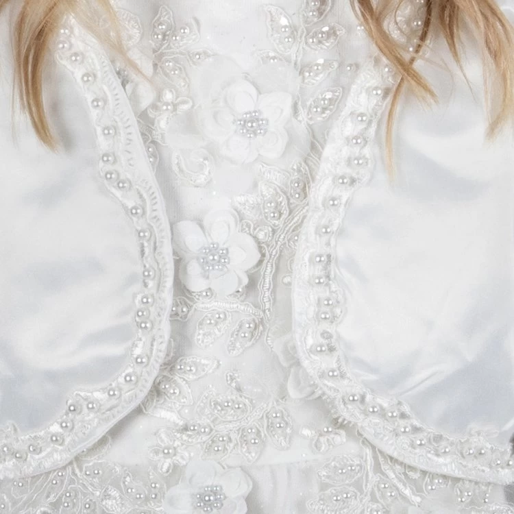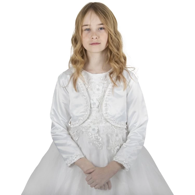 Ivoren meisjesbolero met lange mouwen van satijnachtige gladde stof.