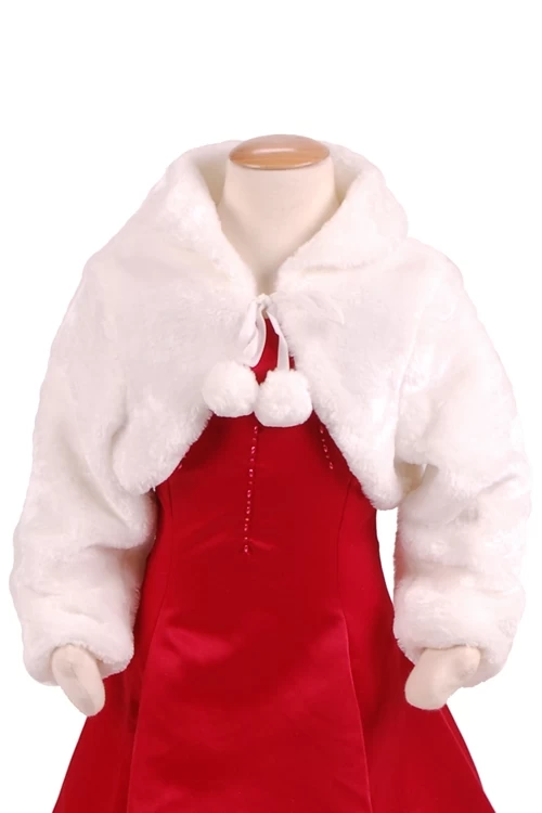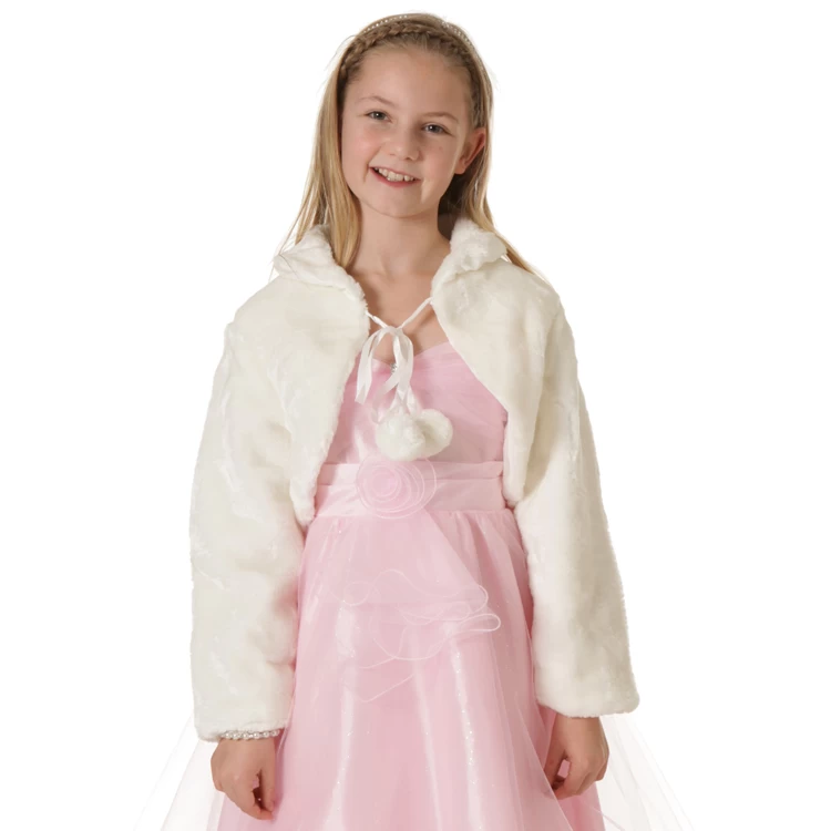 Dit ivoorkleurige jasje voor meisjes gemaakt van nepbont maakt een mooie bruidsmeisjesjurk compleet.