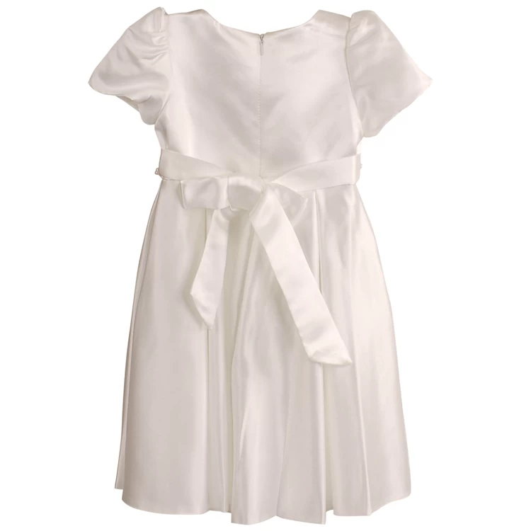 Bruidsmeisjesjurk ivoor gladde stof met pofmouwtjes.