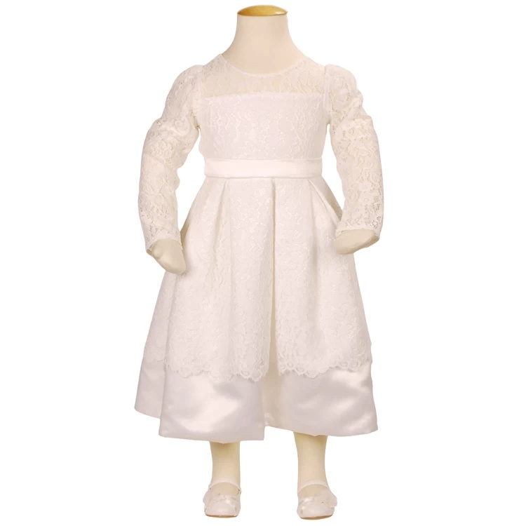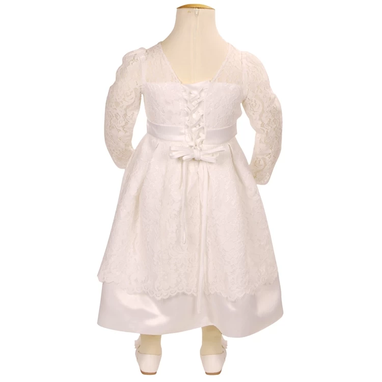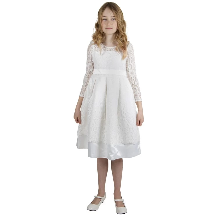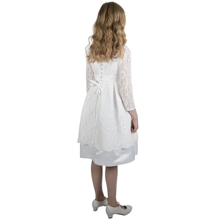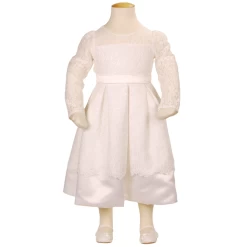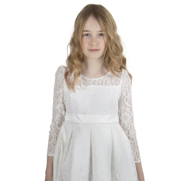 Ivoorkleurige bruidsmeisjesjurk met lange mouwen van kant.