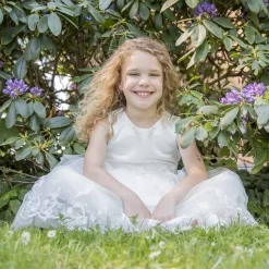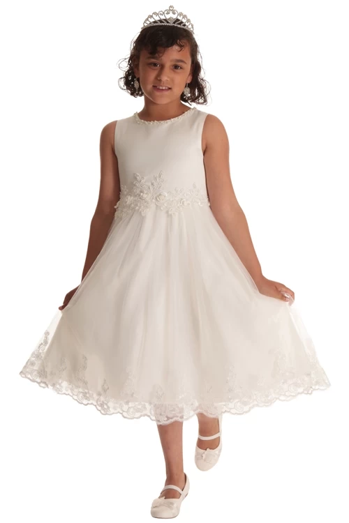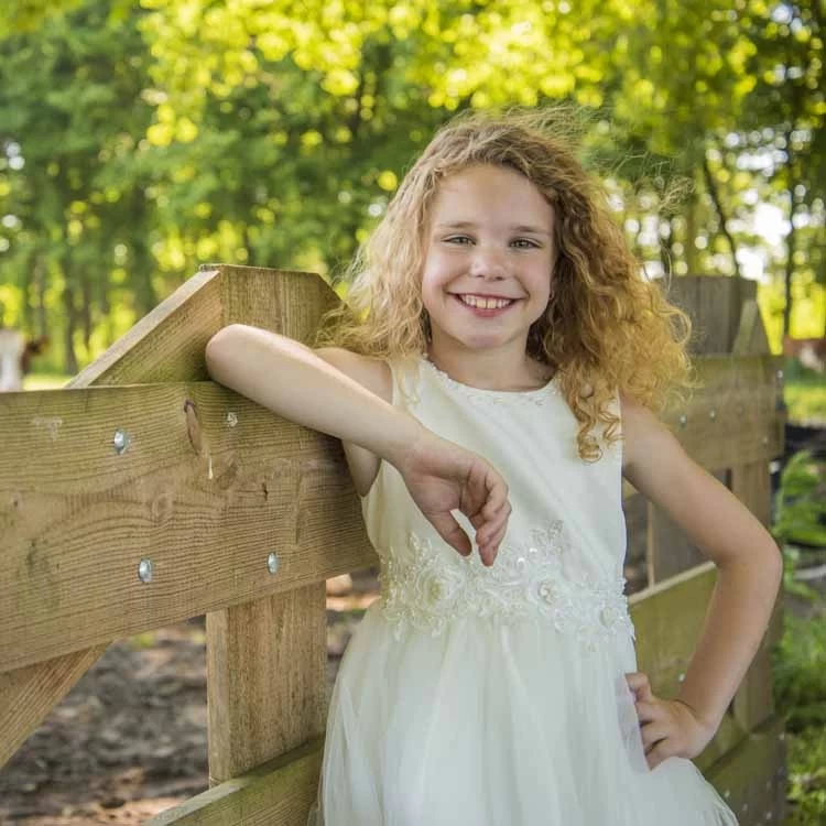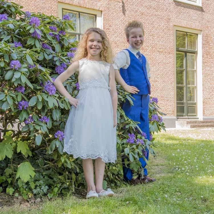 Op de foto is deze jurk gecombineerd met ivoren meisjesballerinas.