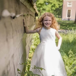 Prachtige ivoren bruidsmeisjesjurk die ook geschikt is voor andere feestelijke gelegenheden.