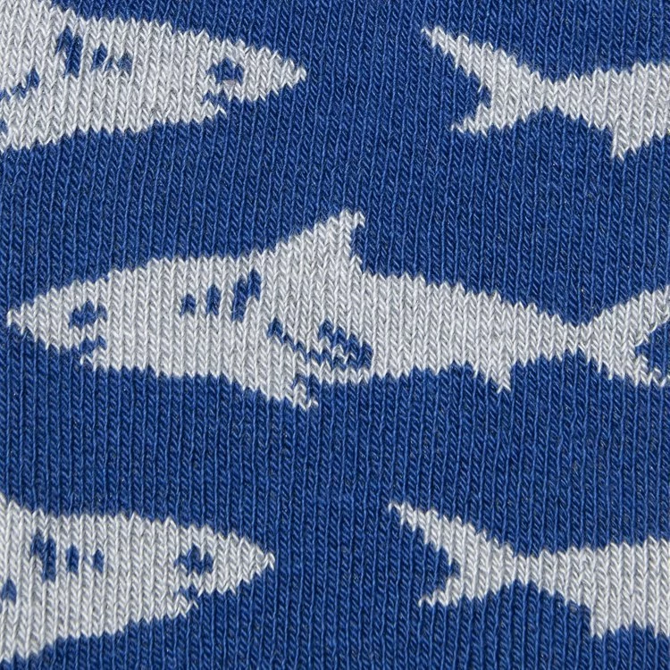 Op deze leuke donkerblauwe sokken staan blauwe haaien.