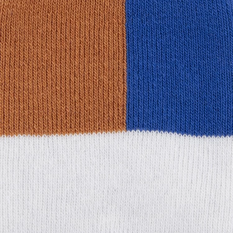 Op deze artistieke sok staan verschillende gekleurde vlakken.