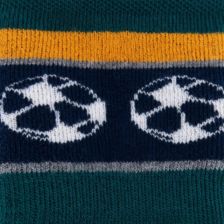 Op deze mooie zeegroene sokken staan voetballen met een leuke oranje streep rondom de enkel.
