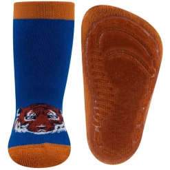 Stoere sokken voor stoere kinderen. De sok is blauw met een bruine onderkant en een bruine rand om de enkel. Op de bovenkant van de voet zie je het hoofd van een tijger.
