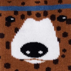 Deze leuke donkerbruine sokken hebben de kop van een beer op de voet en gezellige stippen op de enkel.