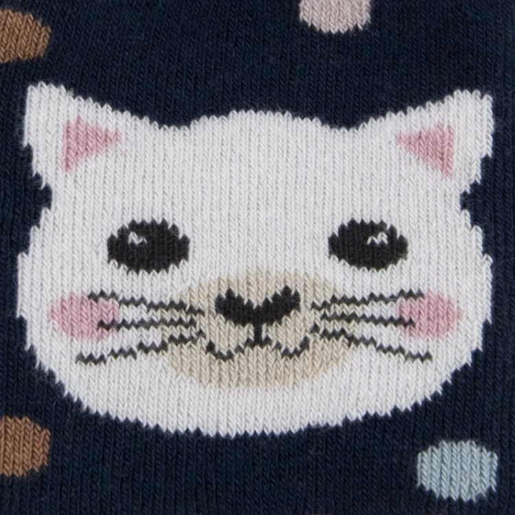 Deze donkerblauwe sok heeft een leuk poezenkopje op de voet staan en gezellige stippen rondom de enkel.