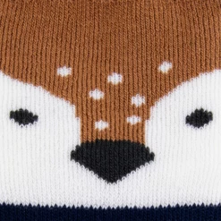 De voet van de sok heeft een leuk blauw en wit streepjespatroon. Met op de enkel het aangezicht van een hertje.