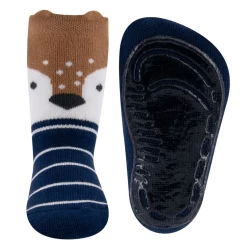 De voet van de sok heeft een leuk blauw en wit streepjespatroon. Met op de enkel het aangezicht van een hertje.