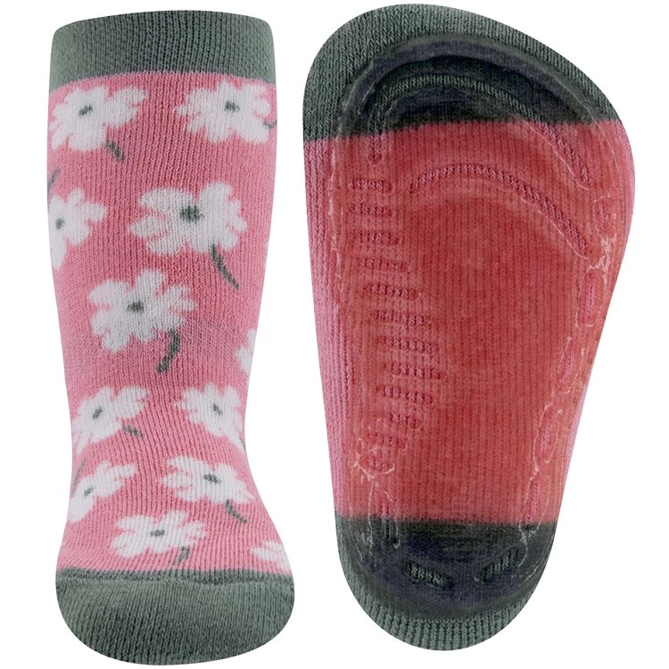 Op deze sokken met antislip staan witte bloemetjes en zijn afgewerkt met groene accenten.