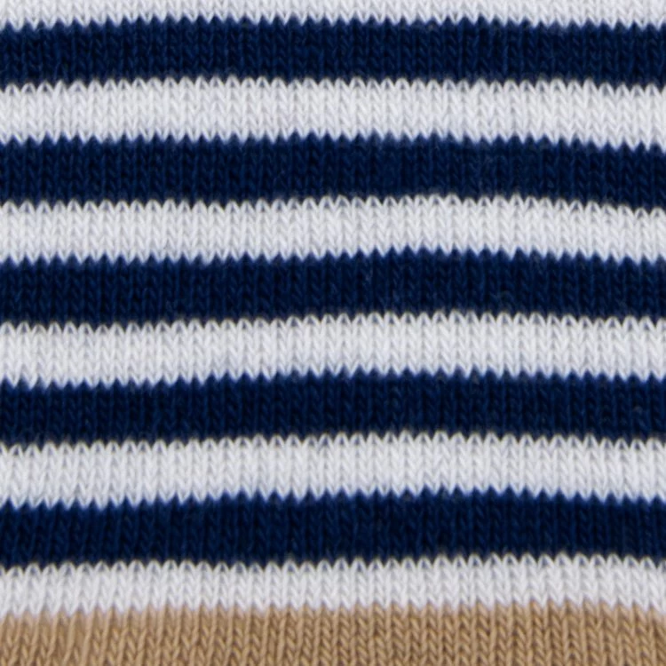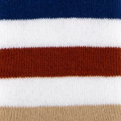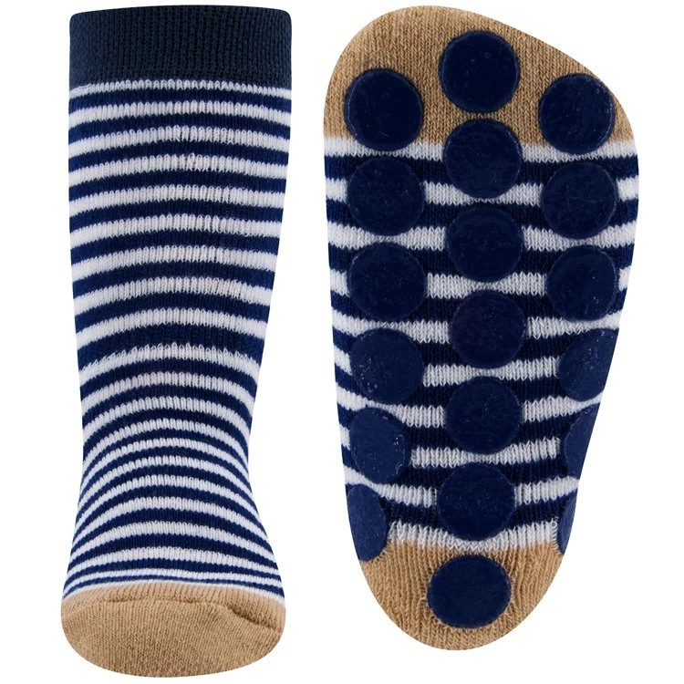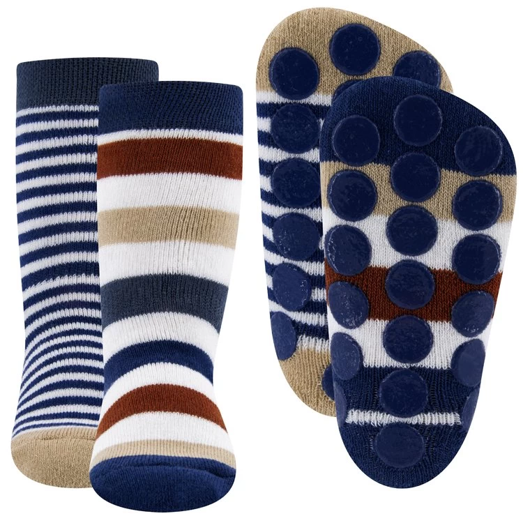 Dit duopack heeft 2 paar sokken geschikt voor jongens en meisjes. Het ene paar is donkerblauw/wit gestreept. De tenen en de hiel zijn beige van kleur. Het andere paar heeft wat dikkere strepen in de kleuren donkerblauw, wit, beige en oranjebruin. Beide sokken hebben een antislipzool bestaande uit kleine circkels.