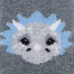 Een duopack met een donker paar en een licht paar sokken. De donkere sokken zijn donkergrijs/lichtgrijs gestreept met een antslip zool in de vorm van rondjes. De lichte sokken hebben het hoofd van een dinosaurus, sterren en de antislip zool is in de vorm van sterren.