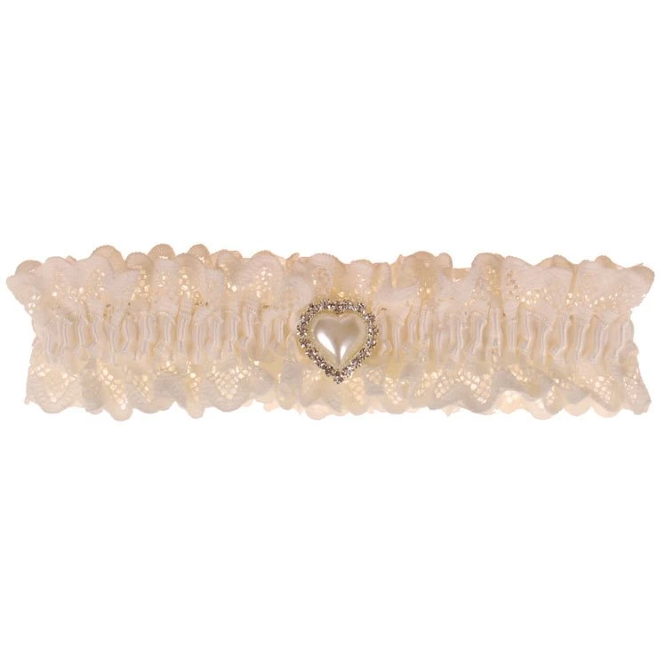 Op de kousenband zit een pareltje in de vorm van een hartje met daaromheen kleine strasssteentjes.