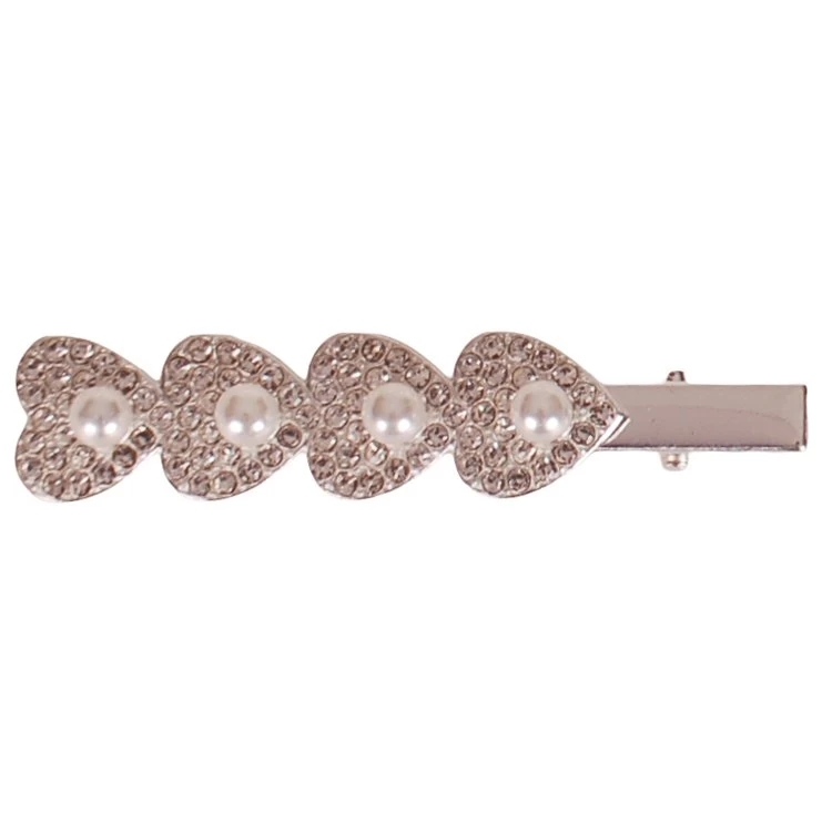 Mooie haarclip met 4 zilverkleurige hartjes gevuld met strass steentjes, met op ieder hartje een pareltje.