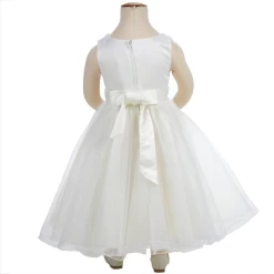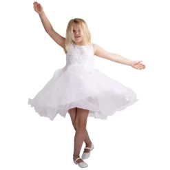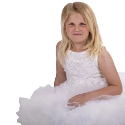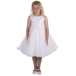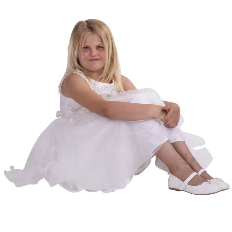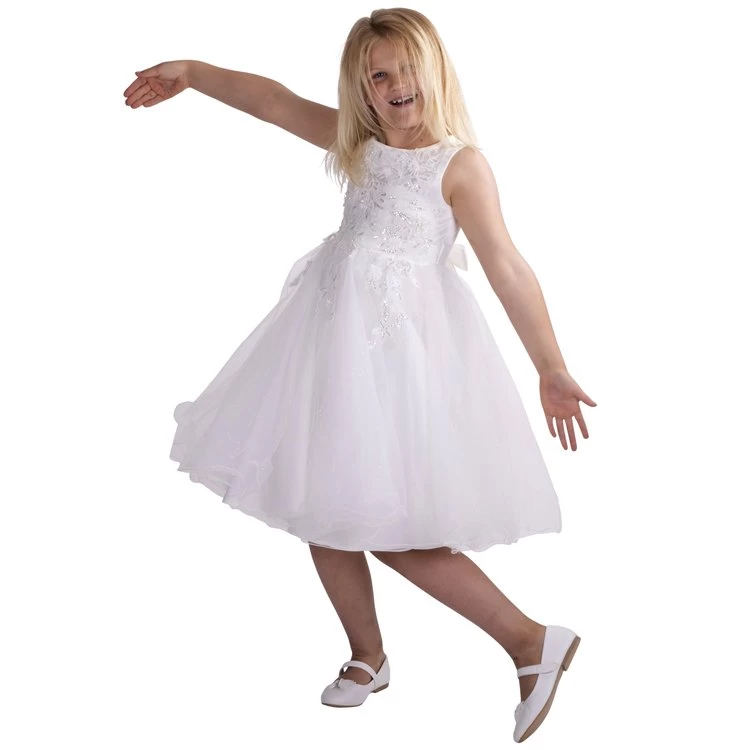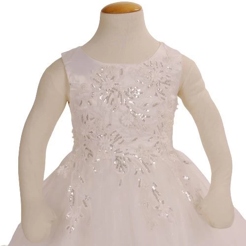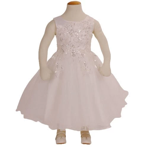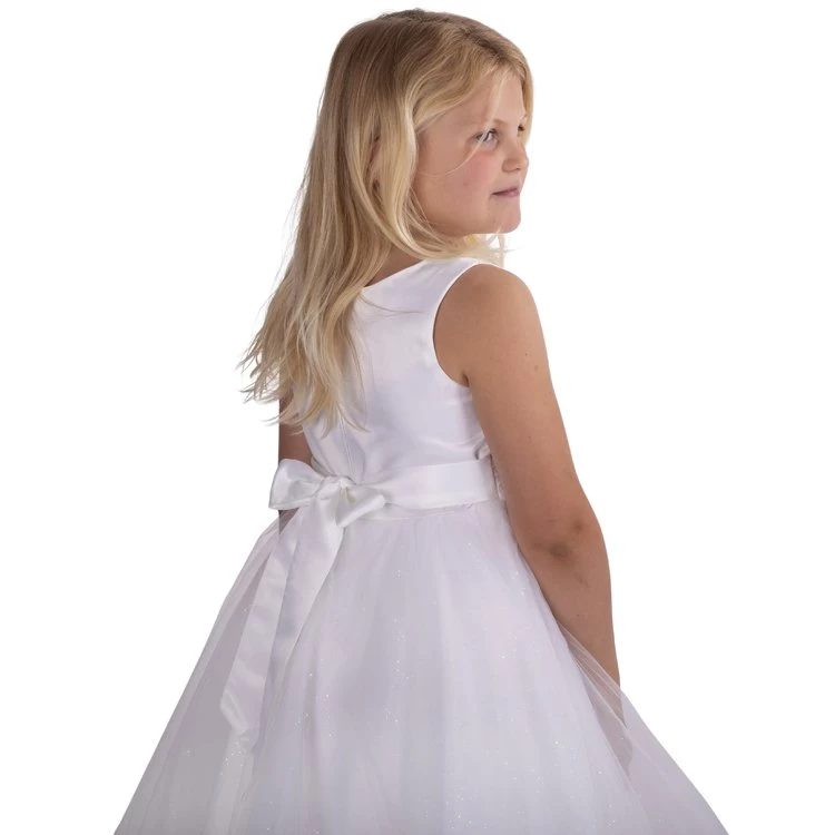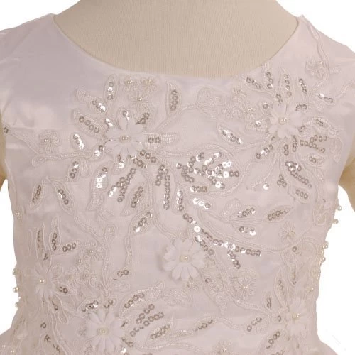 Deze jurk, voor bijvoorbeeld de eerste communie, is mooi afgewerkt met verschillende pailletjes en kraaltjes.