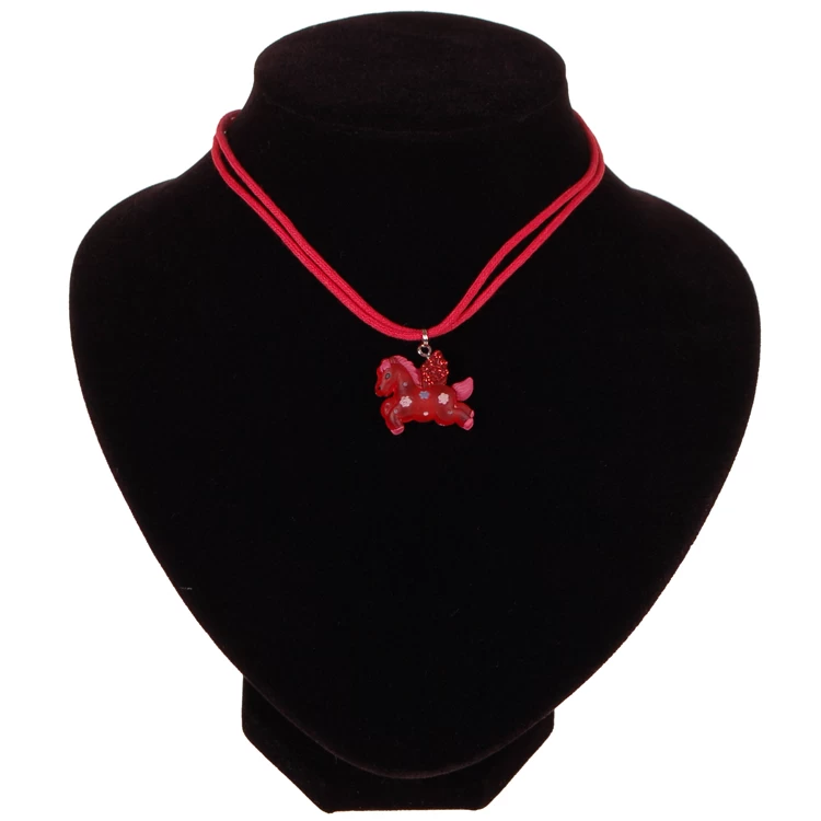 Aan de ketting hangt een rood paardje met rode glittertjes.