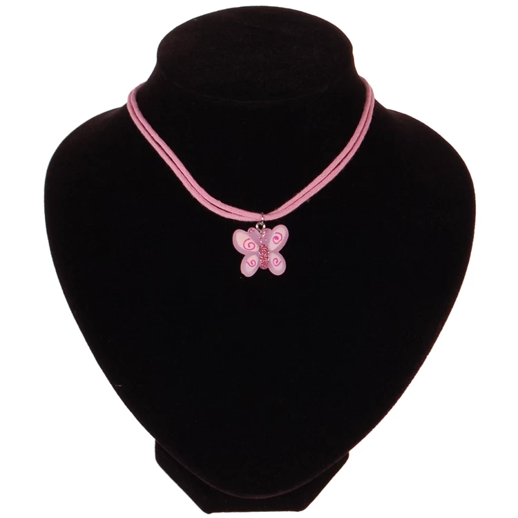 Aan de ketting hangt een roze vlinder met glittertjes.