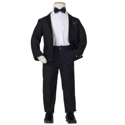Deze kindersmoking is 2-delig en bestaat uit een mooi gevoerd jasje en een zwarte pantalon.
