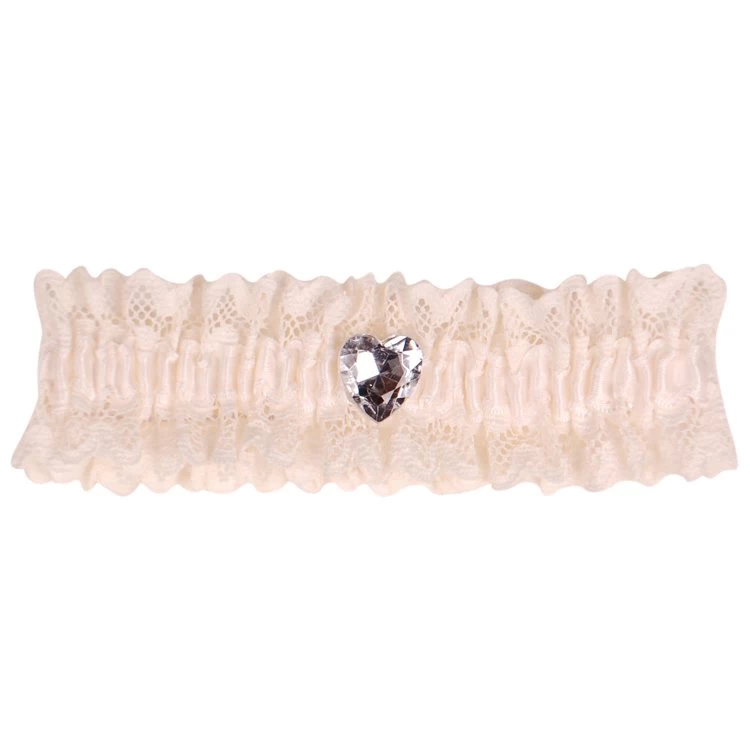 De band is gemaakt van ivoorkleurig elastisch kant, de band is bezet met een strass steentje in de vorm van een hartje.