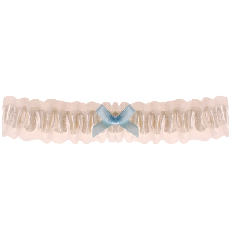 De band is gemaakt van ivoor elastisch kant met een blauw strikje.