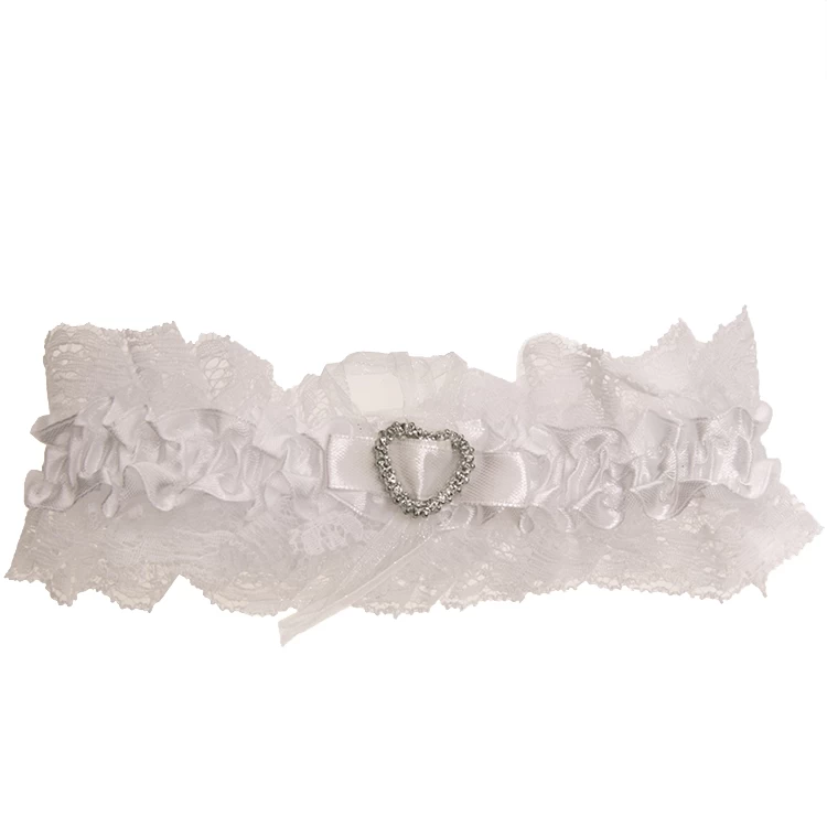 Op het elastische bandje van de kousenband zit een zilverkleurig hartje.