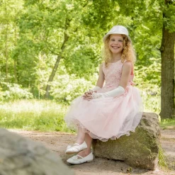 Op de neus zit een bloem van stof en een satijnen roosje.