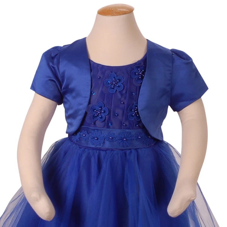 Deze koningsblauwe bolero heeft korte mouwtjes.