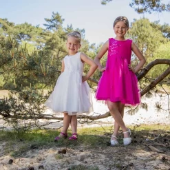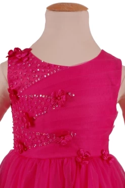 Mooie fuchsiakleurige jurk met op de borst pailletjes, pareltjes en bloemetjes.