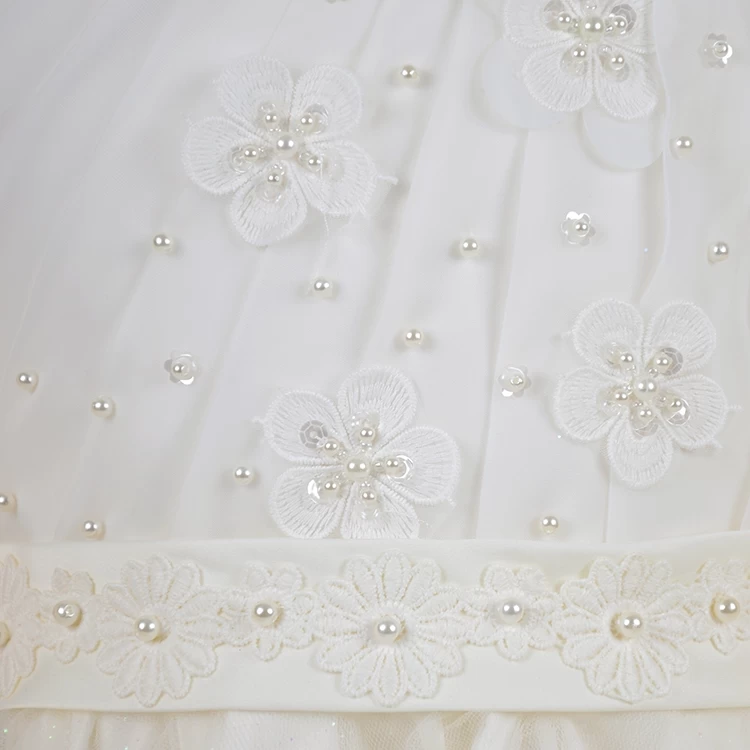 Op het lijfje en de bloemen zitten ivoorkleurige pareltjes.