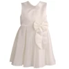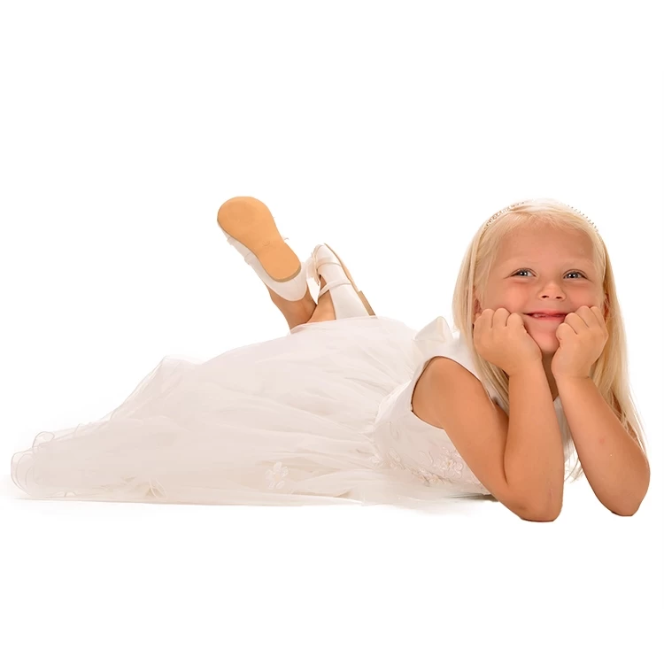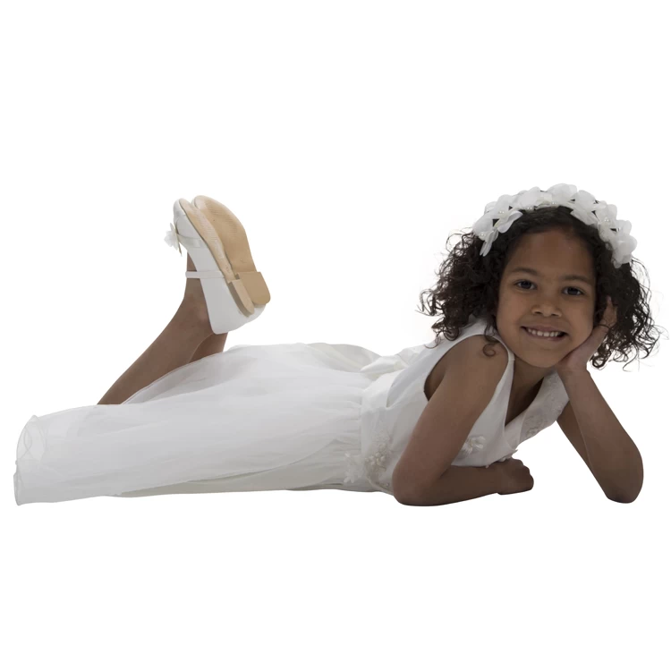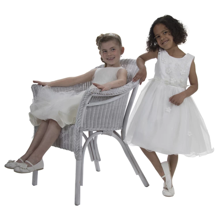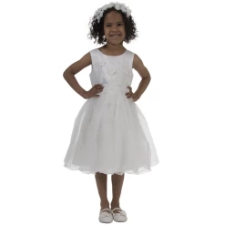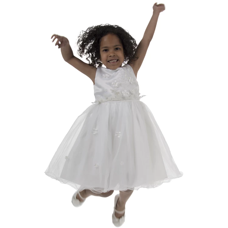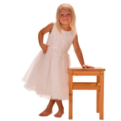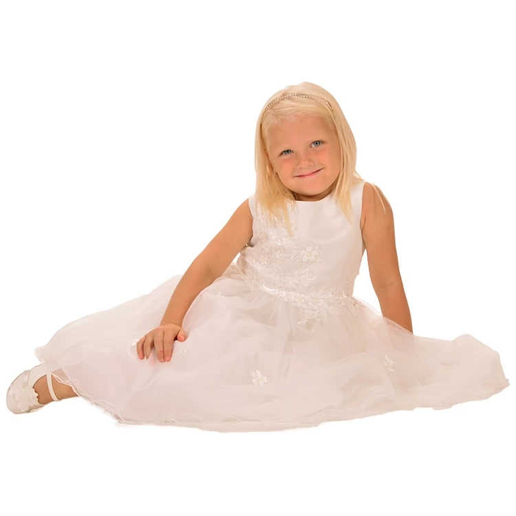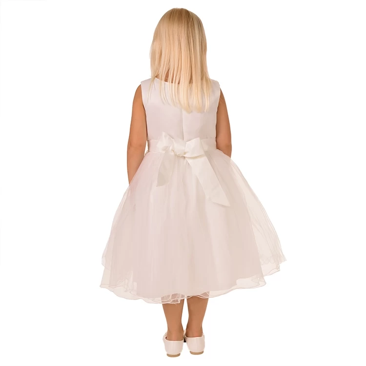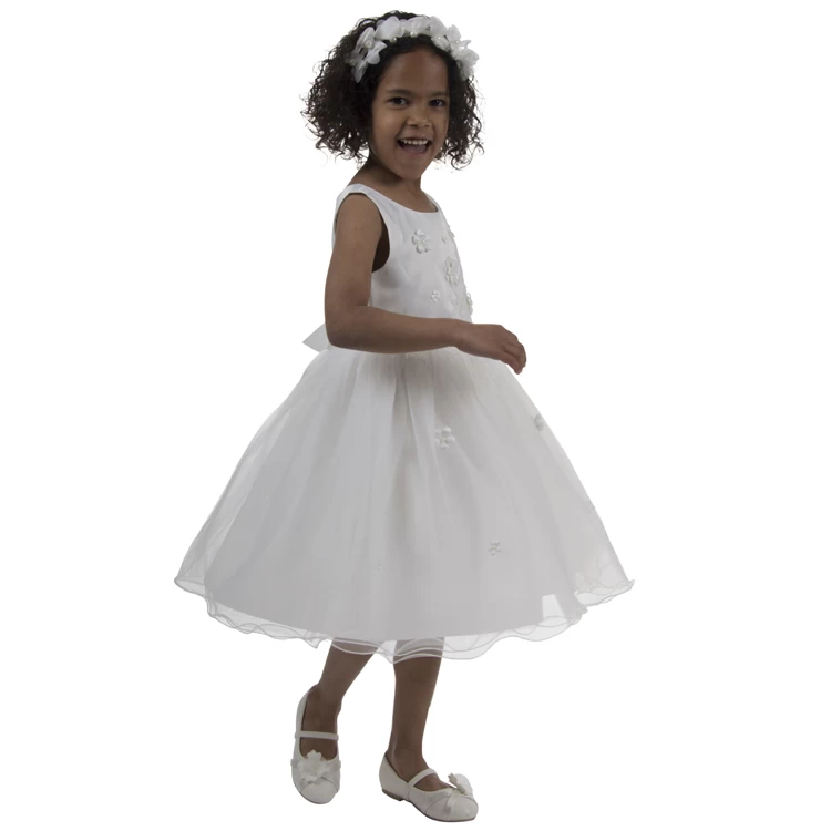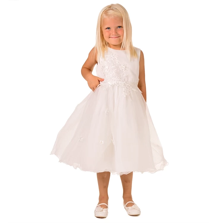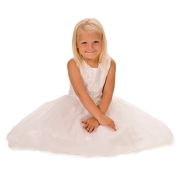 Deze ivoorkleurige meisjesjurk is rijkelijk bezet met ivoorkleurige bloemetjes, kraaltjes en pareltjes.