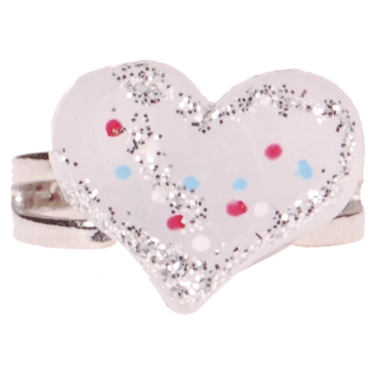 zilver ringetje met een wit hartje en zilverkleurge glittertjes.