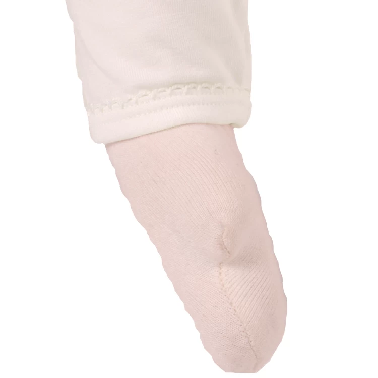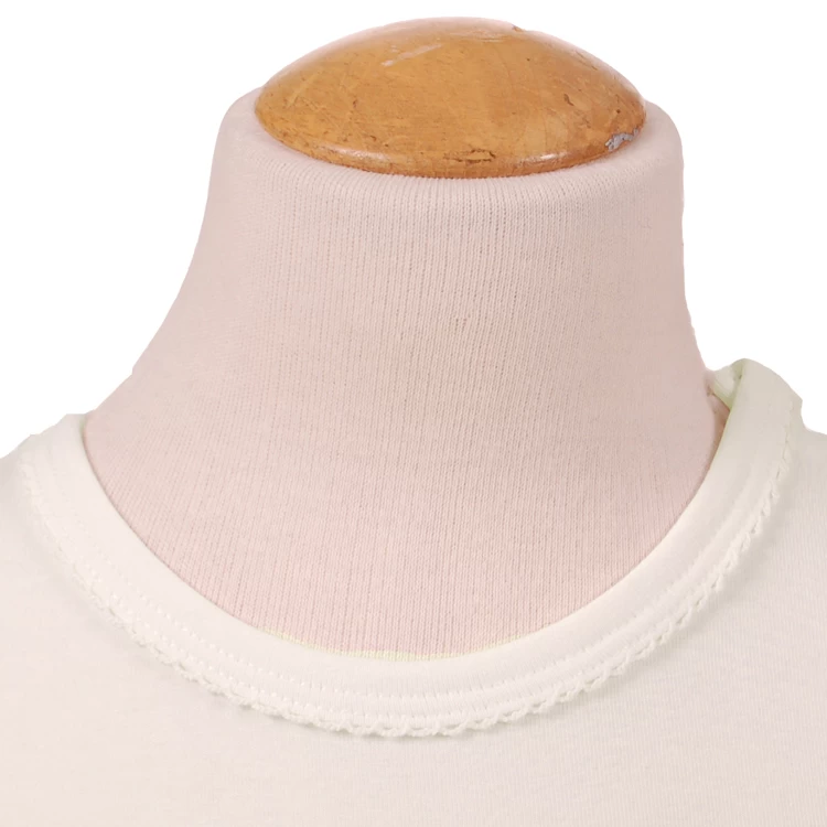 De hals en mouwen van deze meisjes romper zijn afgewerkt met een sierlijk randje.