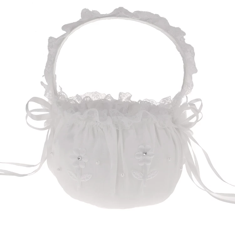 Op de gewatteerde rand van het mandje zitten strass steentjes, geborduurde bloemen, kant en linten.