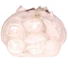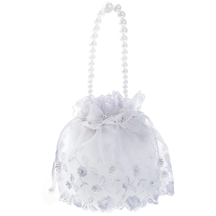 Wit buideltje van een satijnachtige stof met een hengsel van parels.